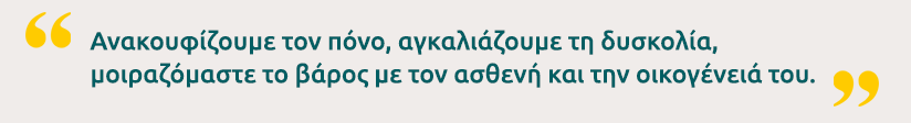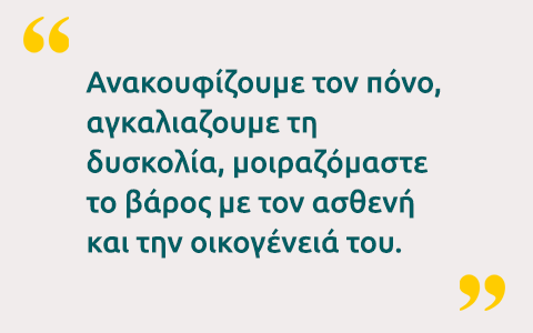 Συνεργαζόμαστε με όλους τους θεσμούς, οργανισμούς αλλά και την Πολιτεία για τη βελτίωση της νομοθεσίας και των πολιτικών που έχουν να κάνουν με την ανακουφιστική φροντίδα. Στόχος μας να στηρίξουμε με αυτήν την κίνηση τις μεγάλες ανάγκες ανακουφιστικής φροντίδας που υπάρχουν και με όραμα να αποτελέσει, η Ανακουφιστική φροντίδα και στην Ελλάδα αναφαίρετο δικαίωμα όσων τη χρειάζονται, ανεξαρτήτως ηλικίας, ασθένειας ή κοινωνικοοικονομικής κατάστασης.